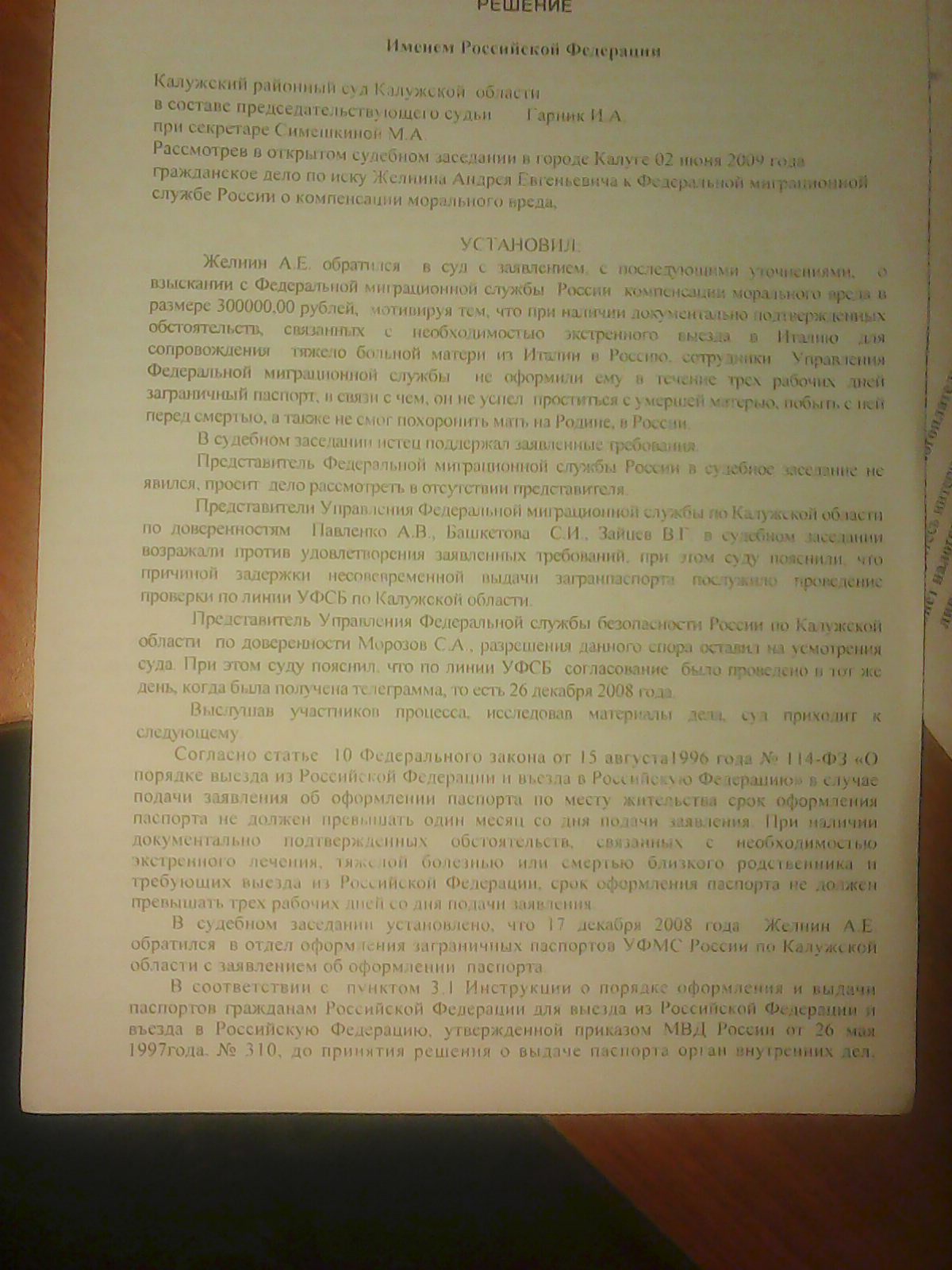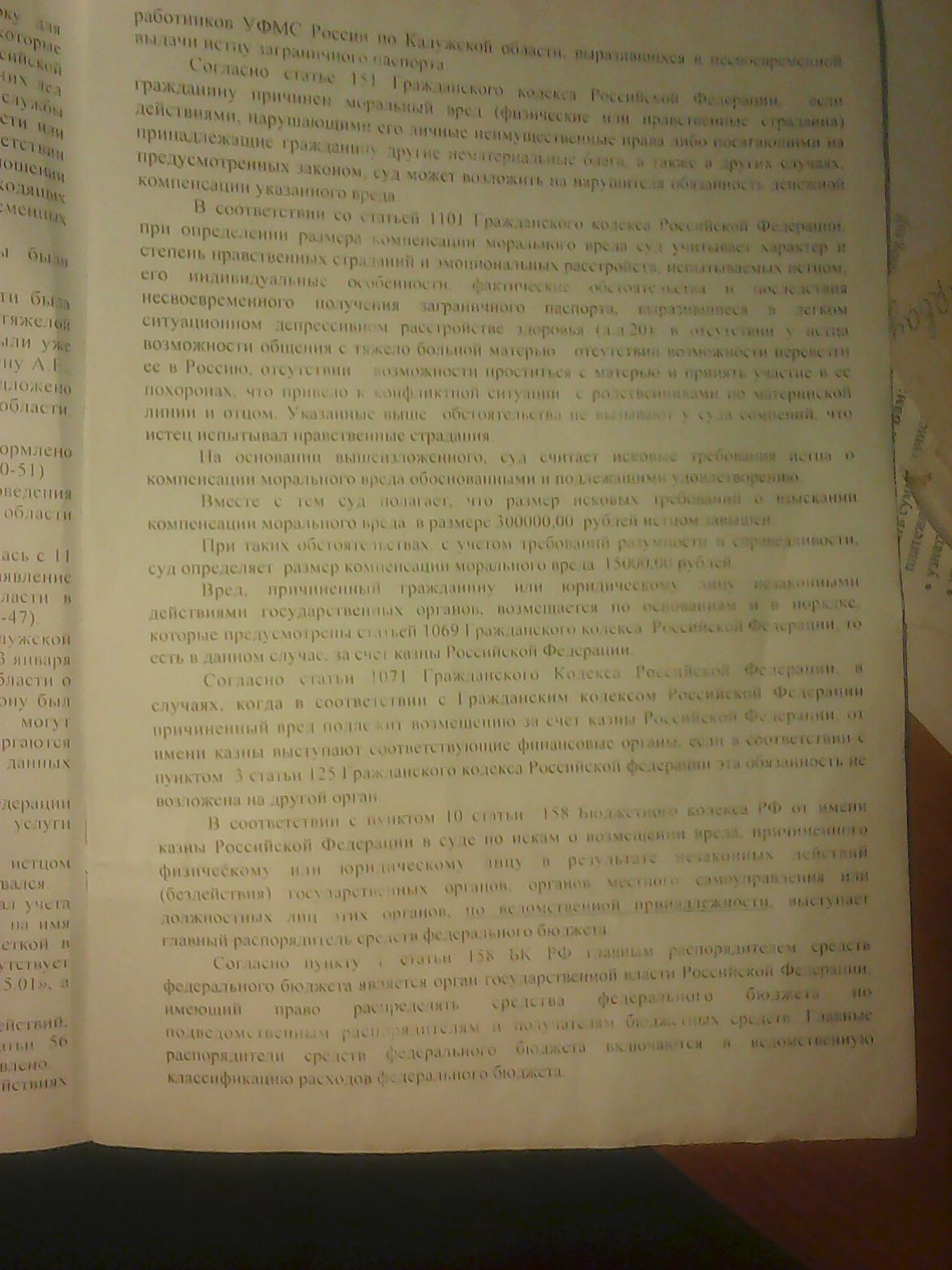 Все было абсурдно, я не смог документально подтвердить, что любил свою мать, на чем настаивал суд, по этому и такое решение, что вызвало улыбки у ответчиков. В результате я потерял работу, да и мать осталась на чужбине. Если нужны какие нибудь комментарии я с удовольствием поясню. П. с. будет ещё одна страничка.