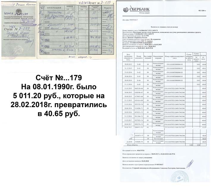 Уважаемая Любовь! Наши любимые руководители страны делают всё, чтобы отнять у народа советские вклады, которые законом признаны как внутренний государственный долг России. Этот долг в самом скромном пересчёте на современные деньги составляет около 47 трл. рублей - это огромадная сумма, которую особо не афишируют в качестве долга. Государство могло бы достойно гасить долг: акциями госпредприятий, землёй, ОФЗ и пр. Прилагаю свою сберкнижку для сравнения сумм 1990 г. и 2018 г. Вам следует взять выписку по вкладу Вашей бабушки - это будет сигнал, что вкладом ещё "интересуются". Если бабушкин вклад "срочный" то сберкасса начисляла на него 3%. Всего Вам Доброго. Спасибо за внимание.