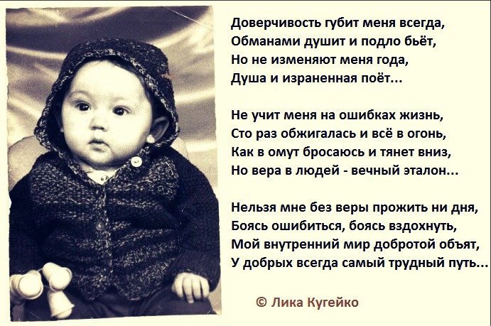 - Умейте верить людям и их словам и обещаниям. Доверчивость - не порок. Это лишь подтверждение того, что Вы порядочный человек, у Вас чистая душа и Вы судите людей по себе.