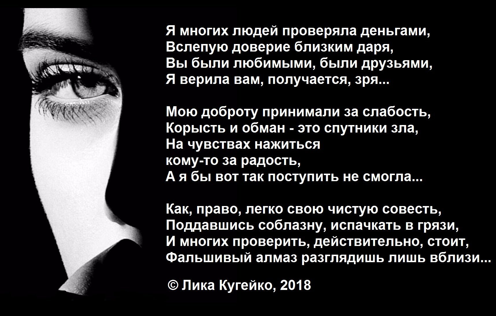 Но не удивляйтесь, когда впоследствии выяснится, что Вас обманули, развели и Вашей добротой и доверчивостью подло воспользовались в корыстных целях, играя на Ваших чувствах.
