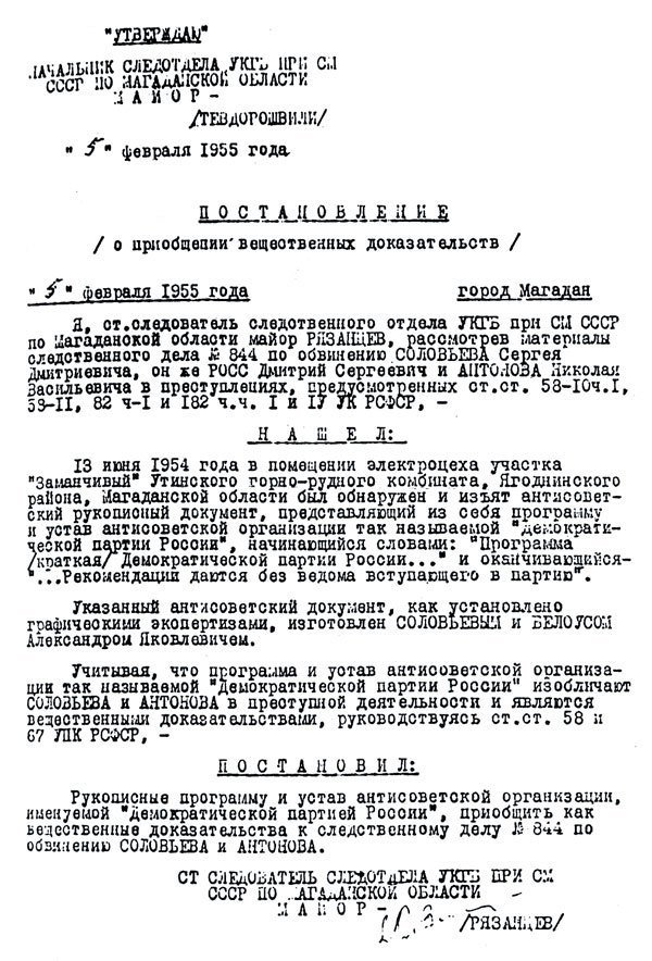 1954, 13 июня. — Обнаружение и изъятие следствием Программы и Устава ДПР в помещении участка «Заманчивый» Уткинского горнорудного комбината.