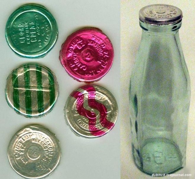 В основном все жидкие молочные продукты в СССР были расфасованы в стеклянную тару, которую затем мыли и сдавали в специальных пунктах приема стеклотары или прямо в молочном магазине. Пол-литровая молочная бутылка стоила 15 копеек, литровая - 20, баночка из под сметаны - 10 копеек.