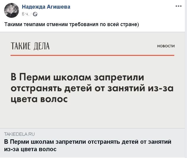 Тетенька подняла хай в либеральных соцсетях и в СМИ, ее поддержали товарки по разуму, и в результате власть сдалась: директора пропесочили на РОНО, а школам Перми было велено до 1 февраля изменить свои уставы так, чтобы не нарушать права хипстеров, гопников и просто придурков, которые захотят явиться в школу в кальсонах.