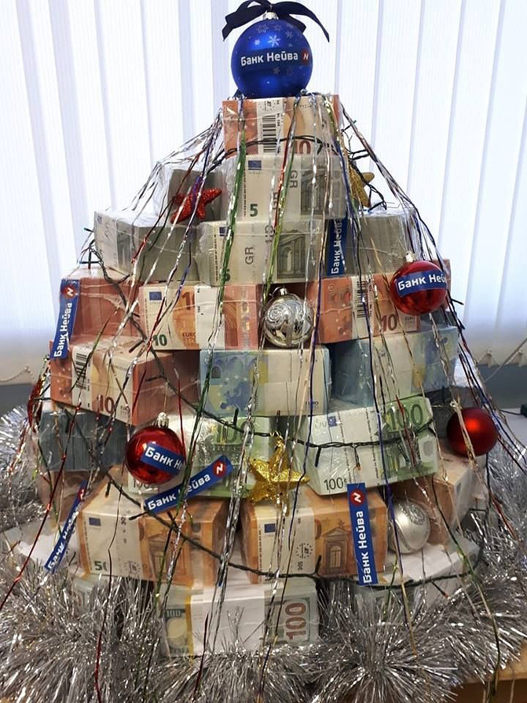 Сотрудники «Банка Нейвы» построили елку из пачек денег, для которой использовали банкноты суммой 1,1 миллиона евро и 1,2 миллиона долларов. Об этом сообщило местное издание E1, которое проводит конкурс самых необычных офисных елок города — собственно, ради этого конкурса сотрудники банка ель и построили.