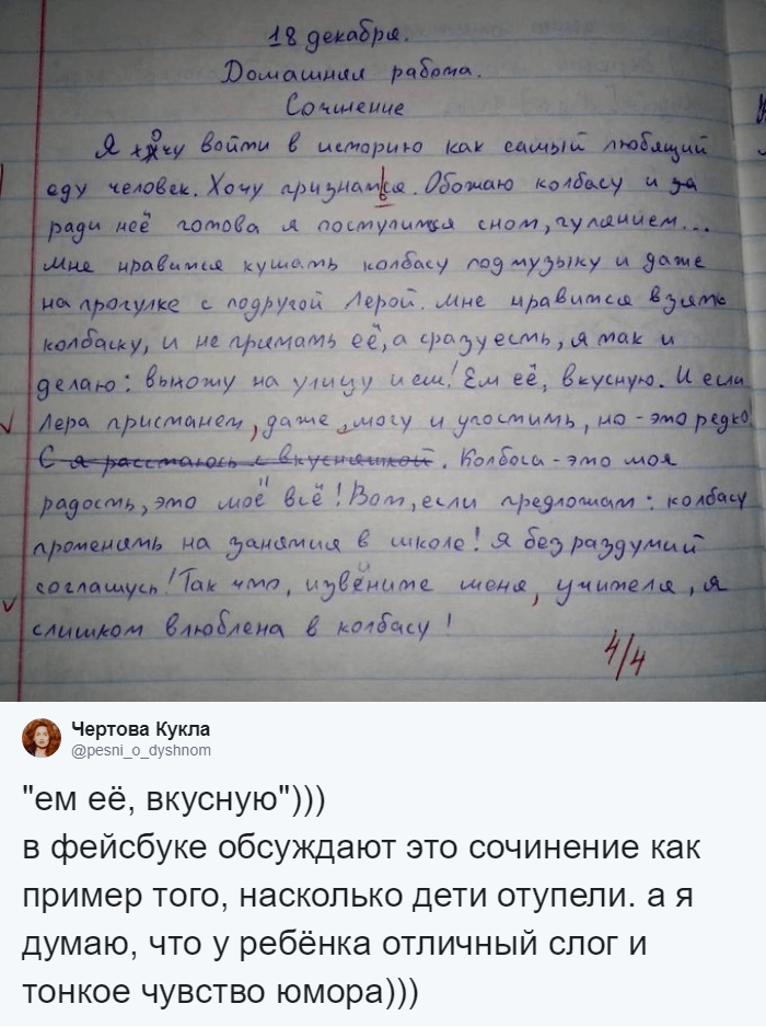 Пользовательница Твиттера под ником «Чёртова кукла» опубликовала школьное сочинение, которое вызвало бурно обсуждение в сети. Автор этого произведения рассказывает об огромной и всеобъемлющей любви к колбасе. Девочка с таким восхищением описывает процесс поедания и её вкусовые характеристики, что у любого потекут слюнки. Её повествование больше похоже на сюжет любовного романа. Пользовательница Твиттера утверждает, что это реальное сочинение 11-летней школьницы, но не раскрывает её имени. За свою работу юная писательница получила 4/4, то есть до пятёрки она не дотянула, а жаль.
