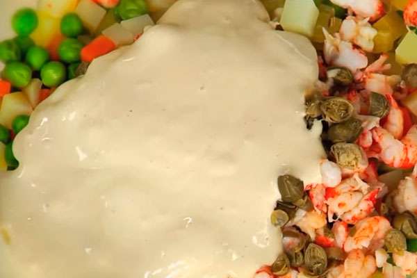 После этого Оливье не стал заморачиваться с длительным украшением коронного блюда, а значительно облегчил ритуал приготовления. Он измельчил и смешал все компоненты, и обильно заправил все соусом.