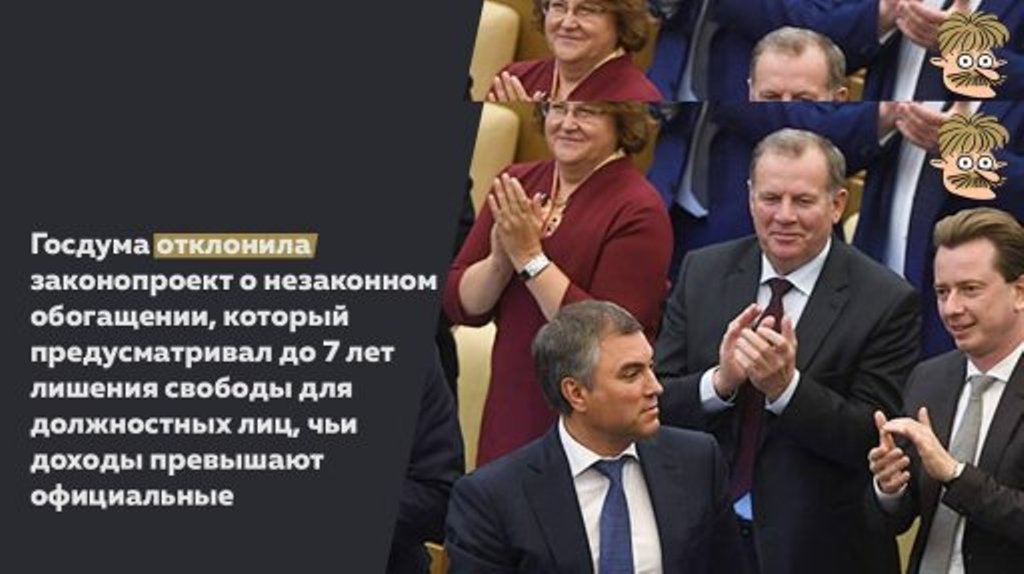 Известно, что вместо этого приняли смехотворный закон о добровольном отказе от таких льгот. Полагая, что у депутатов появится совесть и они сами откажутся. Они же у нас сознательные. Ну а в итоге? Отказались только 10% и то на словах.