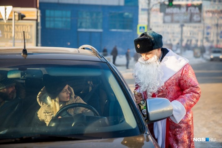 В Новосибирске прошла новогодняя акция городской ГИБДД — полицейский Дед Мороз со Снегурочкой раздавали автомобилистам мороженое и безалкогольное шампанское.