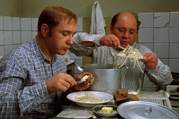 Обед: «макарошки» (45 рублей за килограмм) с овощами и маслом растительным (70 рублей за литр). Иногда гречка — 40-50 рублей за килограмм. Кусок хлеба — 29 рублей за батон.
