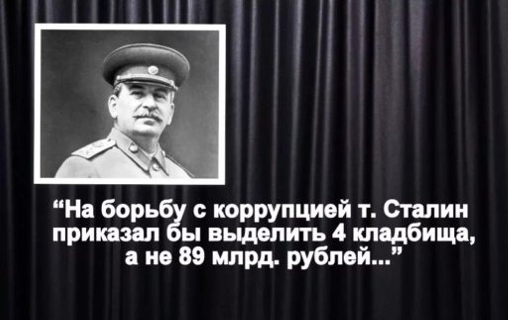 Во-первых, уважаемая Неля Алексеевна, все законы что штампует дума инициированы именно президентом и никем другим. И если бы наш гарант решил удлинить срок за взятку, дума (единая россия) этот закон, который должен быть чётко прописан безо всяких двойственных толкований, без сомнения бы приняла. Но гарант почему-то этого не хочет. Во-вторых, я уже как-то писал, двум правителям в истории России удалось побороть коррупцию на государственном уровне, это Иван Грозный и товарищ Сталин. Это было сделано жёстко, но правильно, и для этого всего лишь нужно чтобы руководитель страны не побоялся взять на себя ответственность.