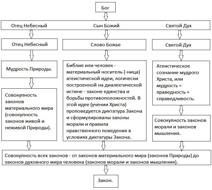 Чтобы правильно понять учение Христа, нужно ответить на главный вопрос - что есть библейский "Бог"? Приведённая ниже (в комментарии) схема даёт ответ на этот вопрос. Библейский "Бог" - это не "Творец", а Закон, истина, идея (атеистическое учение Христа), мудрость (атеистическое сознание Христа), справедливость (высшее проявление мудрости).