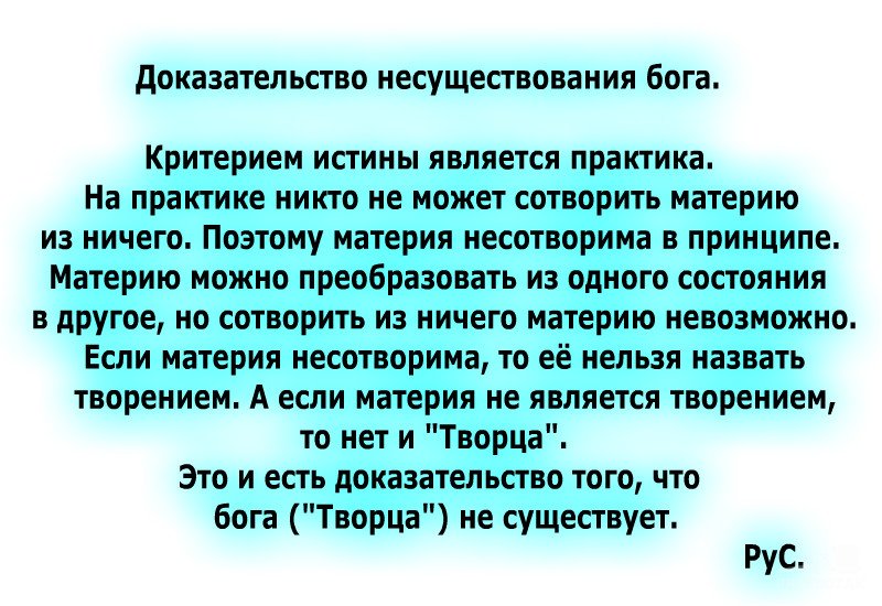 И ещё. Мне никто не сказал, а я вижу своими глазами, что материю невозможно сотворить из ничего, следовательно и "Творца" не существует. Я своим глазам доверяю больше, чем словам миллионов "грешников".