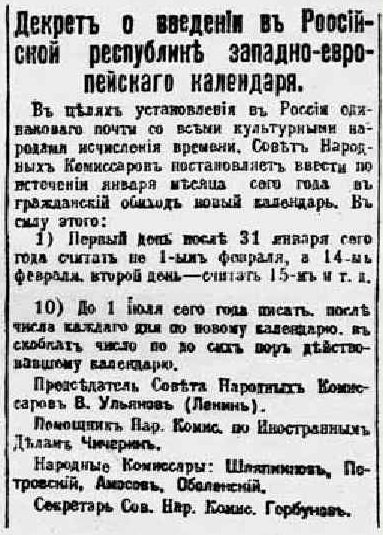 Переход на западноевропейский календарь произошел 14 февраля 1918 года. Согласно декрету, главной целью всего проекта было «установление в России одинакового почти со всеми культурными народами исчисления».