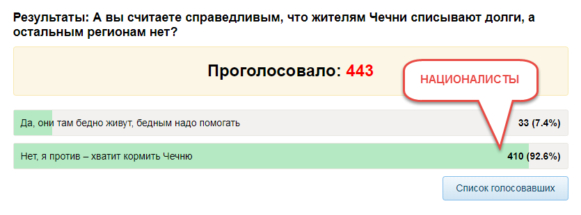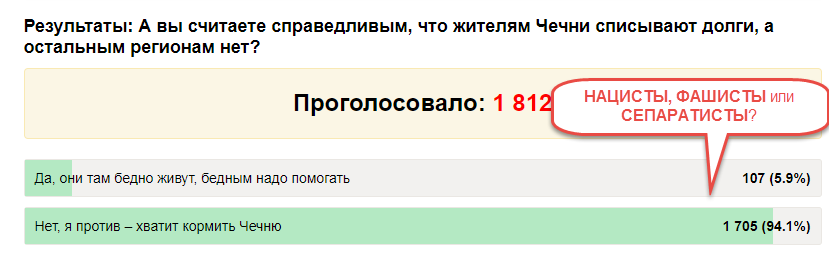 Лиана, не стоит так нервничать. То, что ваш народ живет в нищете лично для меня явилось новостью. В последние годы только и писалось о том, что Кадыров молодец, ибо благодаря ему чеченцы живут очень богато, у них огромные, хорошо обставленные дома, дорогие авто и т.п. Да и населенные пункты шикарно обустроены. И понятное дело, что после такой информации напрашивается резонный вопрос-почему тогда, будучи богатым регионом, чеченцы не платят за коммуналку? Ведь не секрет, что из российского бюджета в ваш регион уходят огромные деньги.