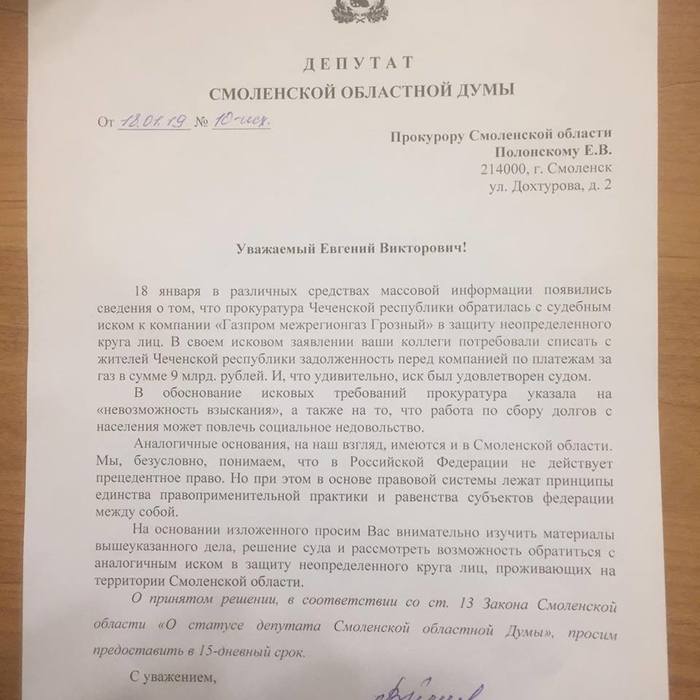 Мне вот интересно — социальное недовольство только в Чечне? А в других регионах какие-то другие люди живут? В общем, решили мы с товарищами по партии Кузнецовым В.В. и Степченковым А.П. обратиться с депутатским запросом в прокуратуру Смоленской области. Пусть изучат опыт чеченских коллег и обратятся в суд с аналогичным иском. У нас по Конституции все граждане и все регионы равны между собой, да и единство правоприменительной практики никто не отменял. Вот и проверим на деле эти конституционные принципы…