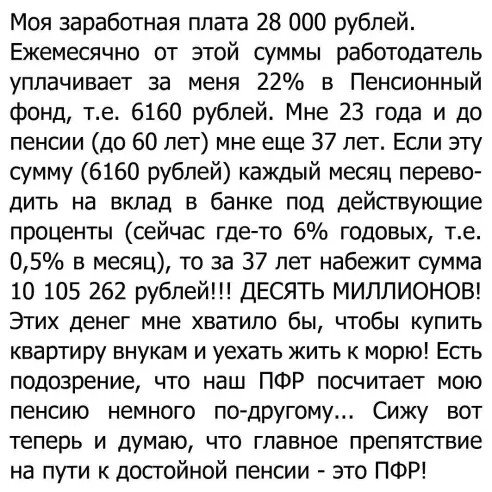 Ошибка № 8 - автор думает что 10 млн руб это круто, но дипломатично умалчивает что через 37 лет 10 млн руб - это ерунда. Сегодня 10,1 млн руб - это как 748 среднестатистических ежемесячных пенсий и позволяет жить комфортно сегодняшнему пенсионеру, но отмотаем в прошлое на 20 лет назад - тогда пенсия была равна 449 руб, следовательно 449 руб х 748 пенсий = 336 000 руб. Если бы эта статья была написана 20 лет назад, то вас бы уверяли что 336 000 руб хватит на жизнь у моря и на квартиру внукам. Купите ли вы сейчас за 336 т.р. квартиру? Этих денег хватит лишь чтобы снимать жилье на море в течении одного года. А что потом? По помойкам лазить?