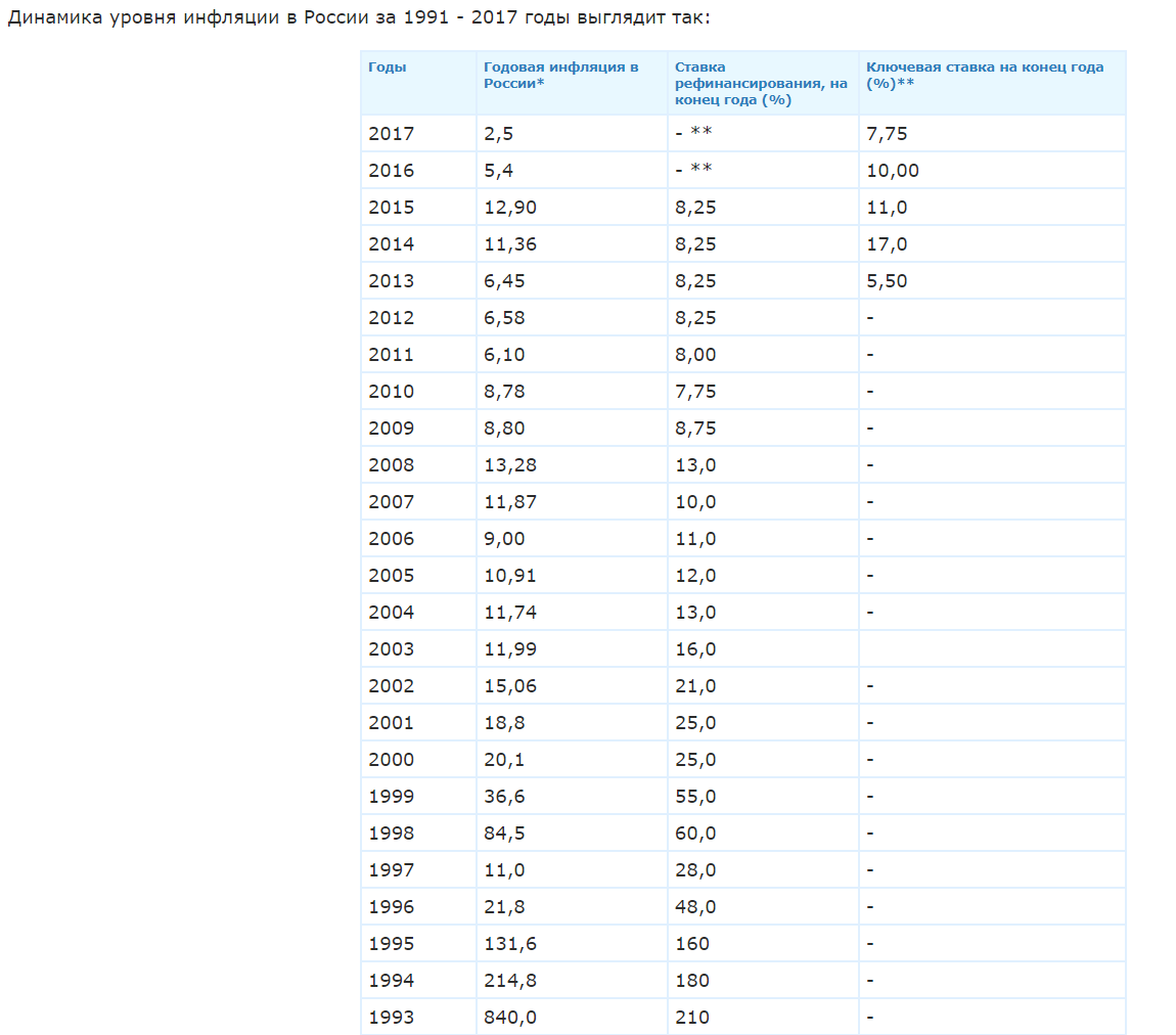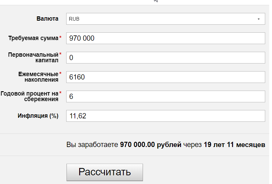 Ошибка №1 если написать в поисковике фразу «калькулятор миллионера», перейти на страницу калькулятора, забить что требуется накопить 10 млн руб с нулевым первоначальным капиталом откладывая по 6160 р в месяц и инфляция равна нулю, то действительно 10 млн руб можно накопить за 37 лет. Но подставим в калькулятор инфляцию равной 4,5% и копить придется уже 72 года (а с инфляцией 4,5% за 37 лет он накопит лишь 3,7 млн руб). Подставим инфляцию равной 6,5% - копить придется 124 (!) года (а за 37 лет накопит лишь 2,8 млн руб). А теперь ближе к реальности, в России за последние 20 лет (и это без учета 1998 г когда инфляция была 84%) официальная средняя инфляция была 11,62%, с такой инфляцией копить придется … калькулятор сообщил что вы никогда не накопите (а за 37 лет накопите лишь 1,33 млн руб).
