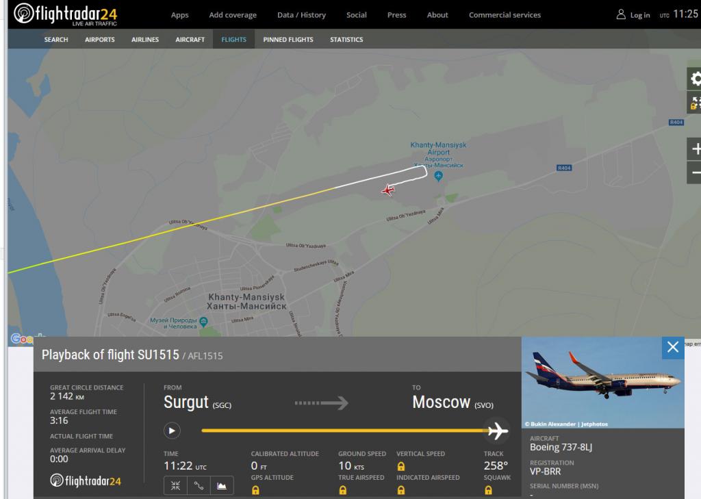 Рейс «Аэрофлота» №1515 вылетел из Сургута в 15 часов по местному времени (в час дня по Москве). Почти через час после начала рейса Boeing 737-8LJ свернул со своей траектории в районе Югорска и взял курс на Ханты-Мансийск.