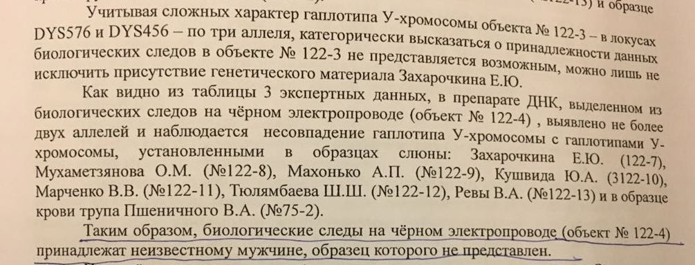 Сомнения должна была снять медико-генетическая экспертиза. Следы семенной жидкости, найденной на теле Пшеничного, содержали ДНК неизвестного мужчины. Неизвестная ДНК обнаружилась и на электропроводе, и на палке, изъятых в СИЗО. Но причиной гибели все равно считалось самоубийство.