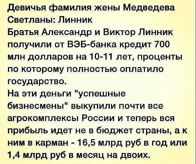 Позвольте вам ответить - , если всеми недрами управляет государство - по факту верно - то почему тогда при таком богатстве, что можно позавидовать (так как др. страны просто мечтают урвать от..) нашим гражданам на еду не хватает - мы уже не о богатстве своем говорим а об элементарном поесть и не болеть! - за услуги расплатится нечем-это кеак и что это? РАЗВЕ может быть такое - а по факту есть на самом деле. И КТО В ЭТОМ ВИНОВАТ простые граждане? Ясно что нет.. квартирку сам не купишь зарплата не позволяет машинку даже и то не каждый потянет учеба дети семьи сколько всего нада - а заплата одна-да и та не смешная-не соответствует - расходам на жизнь - и как то дико даже - что на норм питание и то призодится экономить даже на этом. А ост. понятно что будет недоступно и ПОЭТОМУ влезай в кредит если хочешь жить нормально.. и не ездить на метро дача машина квартира - становиться уже большой роскошью. Почему то у нас.. А должно быть наоборот.. Дети выросли и появились внуки уже и они выросли _а квартирку так и не заработали - и что кто потянет-призарплате такой-значит если нет достойных заплат - то так и будут у нас коммуналки это как