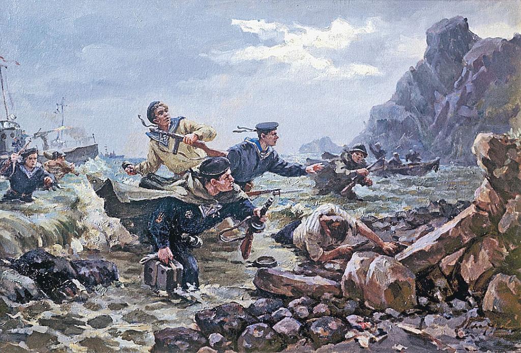 Картина художника Плотнова «Десант на Курильских островах», написанная в 1948 году. На самом деле с боями и потерями (около 400 бойцов) Красная Армия брала Северные Курилы. А японский гарнизон Южных Курил осенью 1945-го сдался без боя.