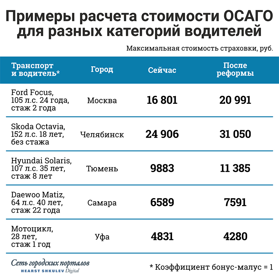 Безаварийность по-прежнему отражает коэффициент бонус-малус (КБМ), который в пределе достигает 0,5 единицы, позволяя сэкономить до половины стоимости ОСАГО. Но для конкретного города базовый тариф будет одинаков для всех.