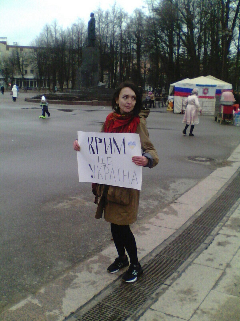 2) На фото петербурженка держит плакат отражающий позицию по захвату крыма написанный на украиском языке.