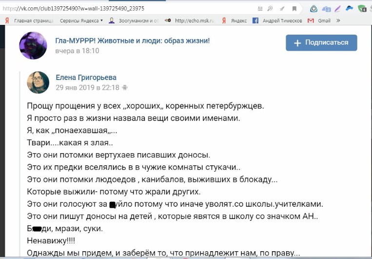 запись, в которой утверждалось, будто бы все нынешние петербуржцы это:"... потомки людоедов, канибалов, выживших в блокаду...