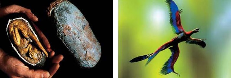 Доказательства родства птиц и динозавров найдены. Известны окаменелости пернатого динозавра Sinornithosaurus milonii возрастом 125 миллионов лет в северо-восточном районе Китая. Синорнитозавр обладал развитыми передними конечностями, которые двигались, как крылья современных птиц. Но эти крылоподобные конечности были не для полета, а для балансировки при движении. В том же районе Китая позднее обнаружили остатки трех видов динозавров возрастом 120 миллионов лет — протархеоптерикса (возможного предка археоптерикса), каудиптерикса (существа, покрытого перьями, правда, более короткими и симметричными, чем это нужно для настоящего полета) и синозавроптерикса (животного размером с курицу, покрытого примитивными нитевидными перьями). Последний был фактически переходной формой от птицеподобных динозавров к динозавроподобным птицам.