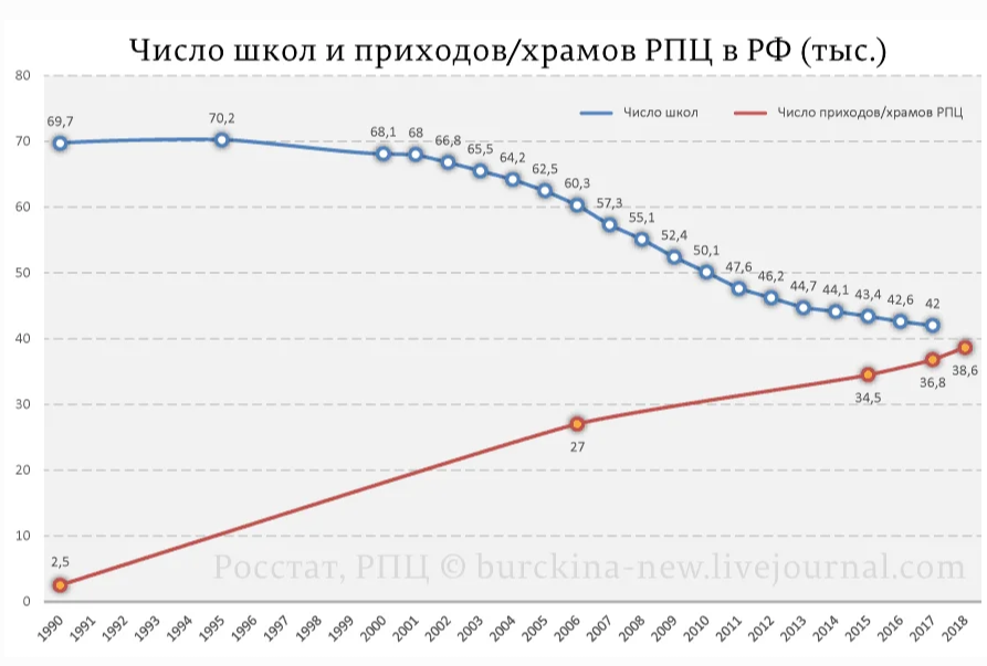 Ну и в довесок. Гундяев в своей речи назвал число храмов и приходов РПЦ в России, что позволило мне обновить график числа школ и православных храмов в России с 1990 по 2019 год.