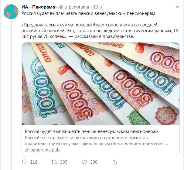 По сообщениям сайта "ПАНОРАМА" сейчас в Госдуме РФ проходят слушания по нашему законопроекту о финансовой помощи пенсионерам и другим социально незащищённым группам населения Венесуэлы. Предполагаемая сумма помощи будет сопоставима со средней российской пенсией. Это, согласно последним статистическим данным, 18 564 рубля 76 копеек. Впрочем, размер выплаты может меняться, например, индексироваться», — рассказал представитель комиссии Правительства РФ по помощи иностранным государствам Владислав Мельников.