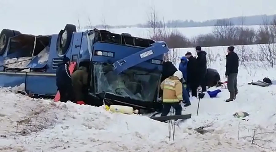 На кадрах, полученных Лайфом с места аварии, видно, что спасателям приходится разрезать сильно повреждённый кузов автобуса, чтобы добраться до находящихся внутри людей.