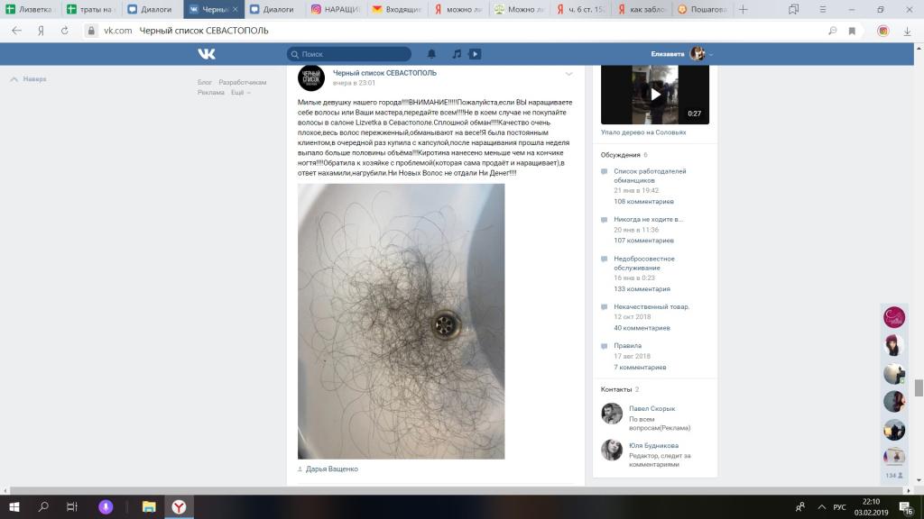Милые девушку нашего города! ВНИМАНИЕ! Пожалуйста, если ВЫ наращиваете себе волосы или Ваши мастера, передайте всем! Не в коем случае не покупайте волосы в салоне Lizvetka в Севастополе. Сплошной обман! Качество очень плохое, весь волос пережженный, обманывают на весе! Я была постоянным клиентом, в очередной раз купила с капсулой, после наращивания прошла неделя выпало больше половины объёма!Киротина нанесено меньше чем на кончике ногтя! Обратила к хозяйке с проблемой (которая сама продаёт и наращивает), в ответ нахамили, нагрубили. Ни Новых Волос не отдали Ни Денег!
