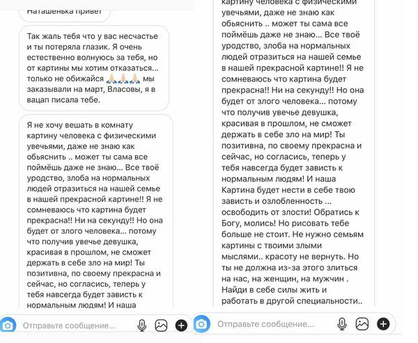 Одна из женщин, отменивших заказ, оказалась куда более прямолинейной (и очень суеверной). Она заявила Наталье в личном сообщении, что «уродство» и «злоба на нормальных людей» художницы якобы повлияют на её семью через написанную девушкой картину. Мол, петербурженка теперь всегда будет завидовать людям со здоровыми глазами и произведения будут нести в себе эти чувства. Согласно авторитетному мнению заказчицы, Наталье нужно бросить рисование, ведь её картины со «злыми мыслями» семьям «не нужны». Вот как выглядели эти мегаэпичные сообщения.