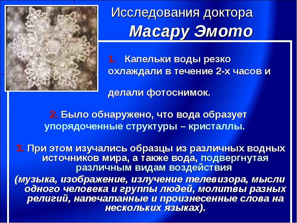 Давно уже было опровергнуто это всё, и что Масару Эмото - мошенник. Не подтверждаются его эксперименты при независимом повторе. Он просто показывал те кристаллы воды, которые подтверждали его вымыслы, а в каждом случае кристаллы были всякие, всяких форм.