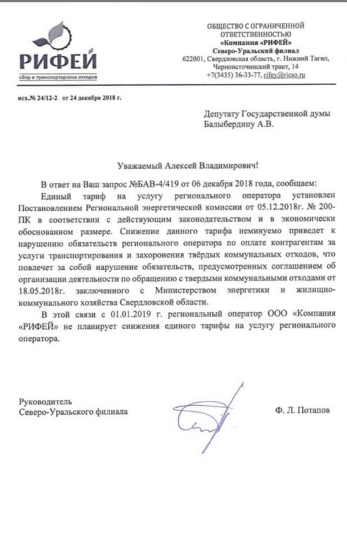 Добавим, сегодня о тарифах «Рифея» у себя на странице в фейсбуке высказался и депутат Госдумы от Нижнего Тагила, единоросс Алексей Балыбердин. Некоторое время назад народный избранник написал несколько запросов в различные инстанции, в том числе – Генпрокуратуру, с просьбой объяснить ему, из чего складывается тариф «Рифея», и не намерен ли регоператор его снизить. На что «Рифей» депутату в конце концов ответил – нет, не намерен. Так как снижение тарифа неизбежно повлечет за собой нарушение обязательств, которые компания взяла на себя перед областным МинЖКХ.