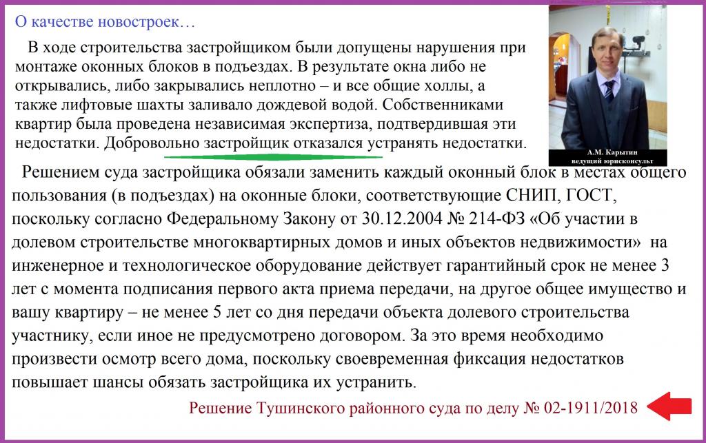 В ходе строительства застройщиком были допущены нарушения при монтаже оконных блоков в подъездах. В результате окна либо не открывались, либо закрывались неплотно – и все общие холлы, а также лифтовые шахты заливало дождевой водой. Собственниками квартир была проведена независимая экспертиза, подтвердившая эти недостатки. Добровольно застройщик отказался устранять недостатки. Решением суда застройщика обязали заменить каждый оконный блок в местах общего пользования (в подъездах) на оконные блоки, соответствующие СНИП, ГОСТ, поскольку согласно Федеральному Закону от 30.12.2004 № 214-ФЗ «Об участии в долевом строительстве многоквартирных домов и иных объектов недвижимости» на инженерное и технологическое оборудование действует гарантийный срок не менее 3 лет с момента подписания первого акта приема передачи, на другое общее имущество и вашу квартиру – не менее 5 лет со дня передачи объекта долевого строительства участнику, если иное не предусмотрено договором. За это время необходимо произвести осмотр всего дома, поскольку своевременная фиксация недостатков повышает шансы обязать застройщика их устранить. /Решение Тушинского районного суда по делу № 02-1911/2018