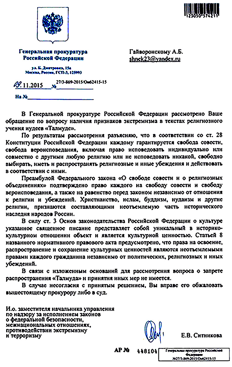 ОТВЕТ ГЕНЕРАЛЬНОЙ ПРОКУРАТУРЫ. О "священных цитатах" из Талмуда...