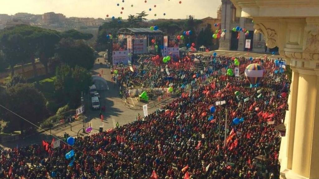 У протестующих, прошедших от площади Республики до площади Сан-Джовани, в руках были плакаты и транспаранты с надписями «Будущее — труду», «Руки прочь от наших пенсий» и «Мы не ваш банкомат». Отмечается также, что люди доставлялись в итальянскую столицу на десяти поездах, 1,3 тыс. автобусов, и двумя кораблями. Точное количество участников не сообщается, однако отмечается, что счет идет на сотни тысяч.