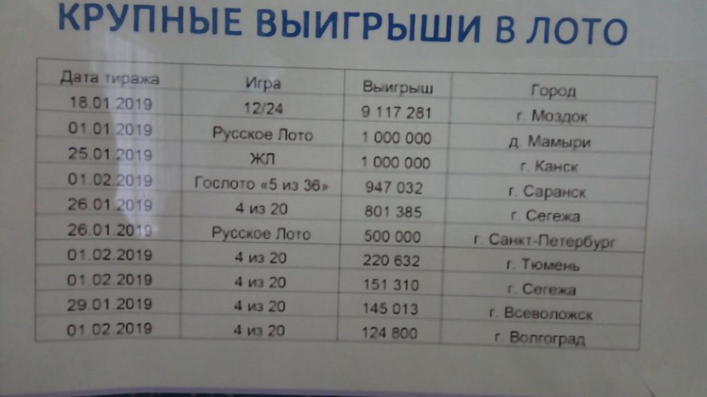 Информация о крупных выигрышах за последние месяцы регулярно публикуется на стендах. (фото прилагается).