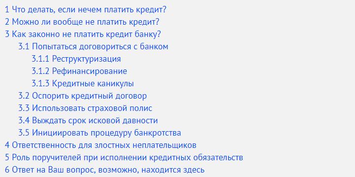 Законно не платить кредит банку в полном объеме не получится, но есть некоторые способы, которые позволят уменьшить сумму долга и увеличить срок его возврата. Каждая ситуация индивидуальна, и выбирать оптимальный вариант необходимо с учетом своих возможностей и требований с другой стороны (например, получить статус банкрота можно лишь после накопления определенной суммы долга и т.д.).