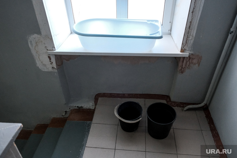 В администрации города Кургана протек потолок. На лестнице, ведущей в малый зал, где проходят заседания гордумы, можно увидеть ведра и другие емкости, куда с потолка капает вода.