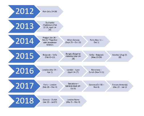 The Insider и Bellingcat удалось получить информацию о передвижениях «Федотова» за 2012–2018 годы, география этих поездок довольно широка, она включает Западную и Восточную Европу, Центральную Азию и Ближний Восток.