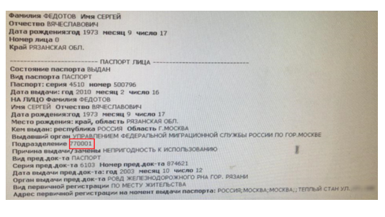 В 2010 году Сергеев получил свое новое имя: Сергей Вячеславович Федотов и получил на это имя загранпаспорт, выпущенный все в том же, ныне знаменитом УФМС 770001, где были выданы загранпаспорта Мишкину, Чепиге и другим ГРУшникам.
