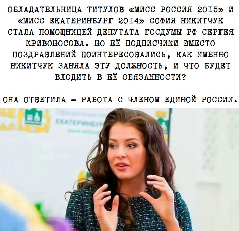 Модель из Челябинской области, а также мисс Екатеринбург — 2014 и мисс Россия — 2015 София Никитчук стала помощником депутата Госдумы от Краснодарского края. Новой должностью девушка поделилась в Instagram****, а в ответ получила оскорбления пользователей соцсети.