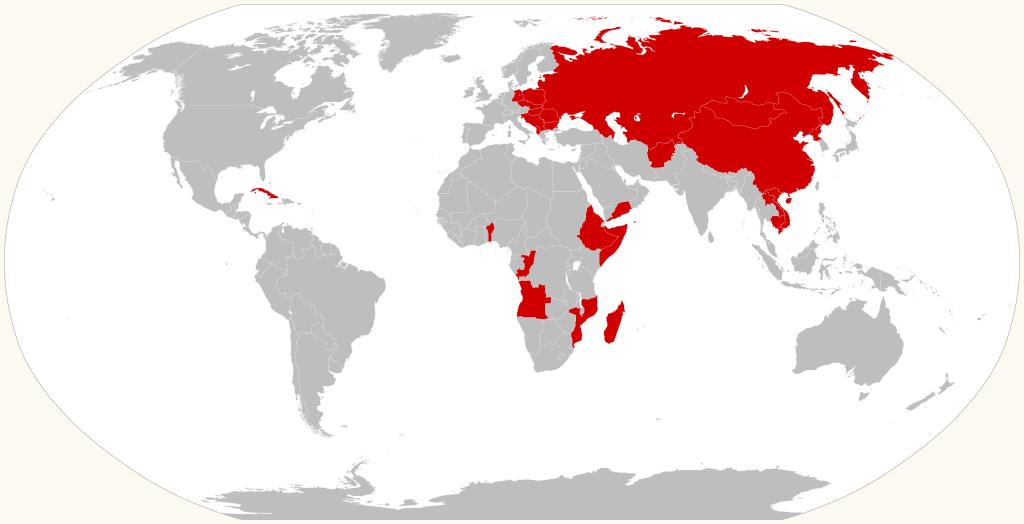 На карте – все страны, когда-либо считавшие марксизм-ленинизм своей официальной идеологией. Обратите внимание, что во избежание всевозможной демагогии "товарищей" в комментах, на карту нанесены коммунистические страны, которые считали или считают марксизм-ленинизм своей официальной идеологией, без учёта стран-симпатизантов (типа Буркина-Фасо, Чили до Пиночета и Египта), а также стран, которые хотя и не были/не являются формально коммунистическими, но по факту проводили леворадикальную политику (типа современной Венесуэлы, Зимбабве, Замбии, Ливийской Джамахирии и т.п.). Разумеется, и эти режимы закончили плохо, но всё же они не провозглашали официально построение коммунизма своей основной целью.