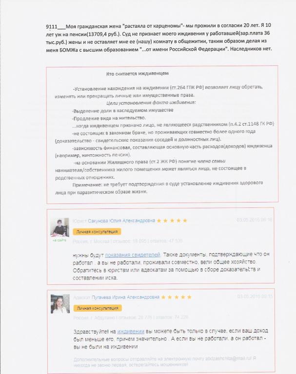 И меня в Березовке хотят съесть. Сколько беды, горя вокруг - одним есть нечего, другим жить негде. А на ТВ решают, как же помочь пенсионерам. Вот горячая история. Мне 71, высшее, непрерывный стаж 42. Мы в Березовке в общежитии ТЭЦ-3 прожили более 15 лет; многие знают, какое это жильё. Работали, старались, улучшали это житьё-бытьё: новый оконный блок и двери, кондиционер и холодильник, заменили батарею и водо-тепло-электро разводку, ламинат на пол, плитку на стены, новая мебель, раковина, унитаз, обновили всю бытовую технику. Жена более 25 лет работала на ТЭЦ-3, была здорова (проверяли)... и вдруг-приступ, больница, операция и смерть от рака поджелудочной железы. Боль утраты, слёзы, похороны... и предложение "сдайте ключи и выселяйтесь"; и в этом кроется "юридически обоснованный", хищнический способ отъема нажитой собственности, безапелляционного лишения прав человека на жильё. Но, всё ведь просто, это - предложите продлить/перезаключить договор аренды для дальнейшего проживания! ...Два года длится юридическая/судебная круговерть (а на ТВ всё решают судьбу пенсионеров). С меня юристы скачивают "пенсионный жирок", кто-то в ожидании, когда "занесут" (не доказуемо); все при деле и интересе. Словом - едят! А о судьбе Человека - нигде не упоминается. "Или сено сгорит или ишак сдохнет", - от инфаркта, инсульта... или замерзнет. ...71-я болею, впроголодь и долго не выдержу,-- "но это будет уже другая история". Отзовитесь, россияне. Правду и только правду кратко изложил Юрий Л. 15-02-2019 _Хабаровск
