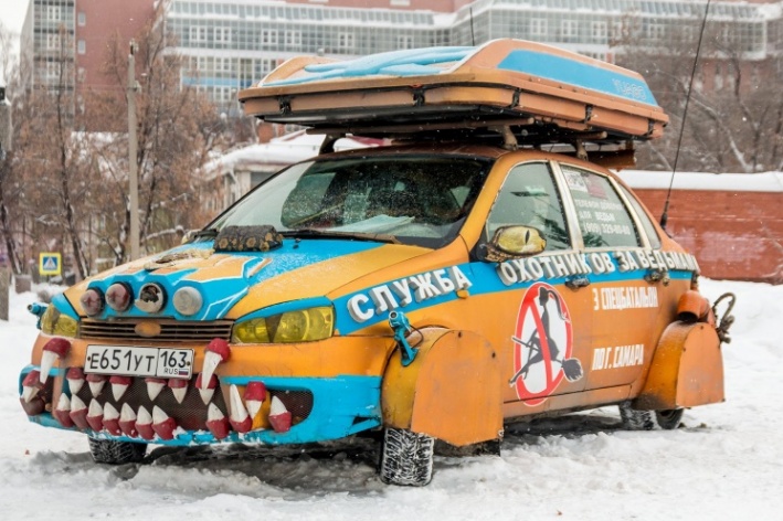 Это чудо креатива и конструкторской мысли известно каждому жителю Самары: по улицам колесит бывшая «Калина», которую ее владелец Олег Красильников превратил в автомобиль для охоты на ведьм и приведений. Изначально машина была темно-синяя, потом Олег обклеил ее черной пленкой, а после — золотистой. Приделал ручки причудливой формы, арки на колеса, решетку радиатора украсил зубами, а капот — объемными буквами «Служба охотников на ведьм». Салон украсил золотом и узорчатым рисунком, так что теперь изнутри машина похожа на коробку конфет.
