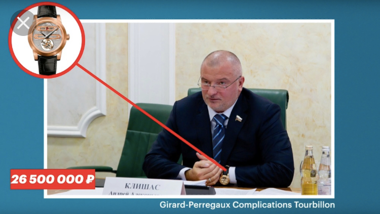 Клишас считает что, видя сенатора в дорогом костюме и часах, люди уверены, что он не будет заниматься коррупцией и воровать деньги из бюджета государства.