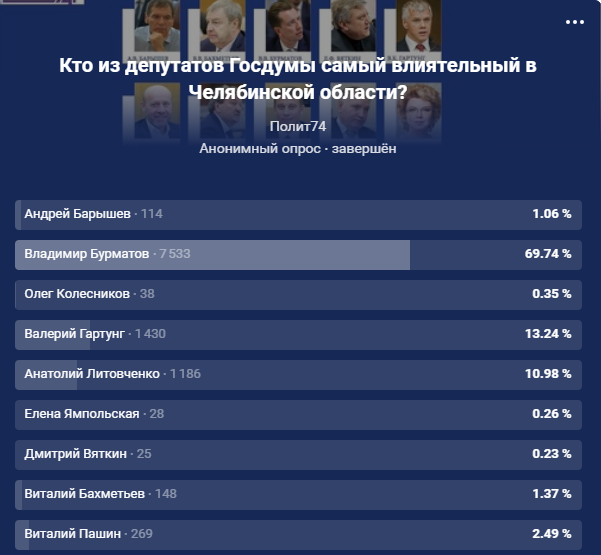 В сообществе было размещено голосование за самого влиятельного в Челябинской области депутата Государственной Думы. В нем приняли участие 10802 человек при том, что у паблика «Полит 74» всего лишь 1840 подписчиков.